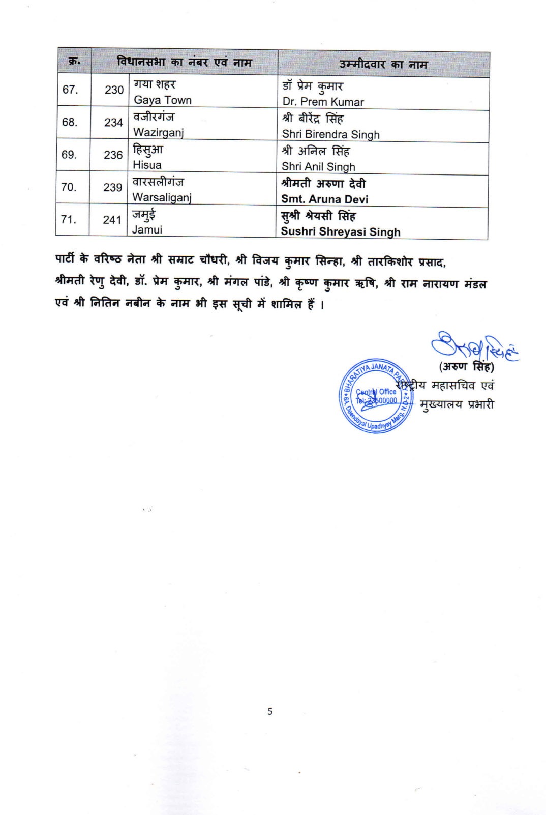 इसके अलावा, गायत्री देवी परिहार से, नीरज कुमार सिंह बब्लू छतरपुर से, तारकिशोर प्रसाद कटिहार से, मंगल पांडे सिवान से और डॉ. प्रेम कुमार गया टाउन से लड़ेंगे। रामकृपाल को दानापुर से टिकट दिया गया है। लेकिन सूची में नंदकिशोर का नाम शामिल नहीं है।