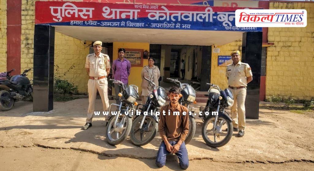 बूंदी: बूंदी कोतवाली थाना पुलिस की कार्रवाई, एसपी राजेंद्र कुमार मीना के निर्देशन में एसएचओ भंवर सिंह ने की कार्रवाई, पुलिस ने शातिर वाहन चोर को चोरी की 4 बाइक समेत किया गिर*फ्तार, पुलिस ने आरोपी देवप्रकाश सुमन उर्फ दीपक (25) पुत्र भंवरलाल निवासी रायथल जिला बूंदी को किया गिर*फ्तार, पूछताछ के दौरान आरोपी ने कोतवाली बूंदी और सदर बूंदी थाना क्षेत्रों से चार अन्य बाइक चोर की बात कबूली, पुलिस जुटी जांच में।