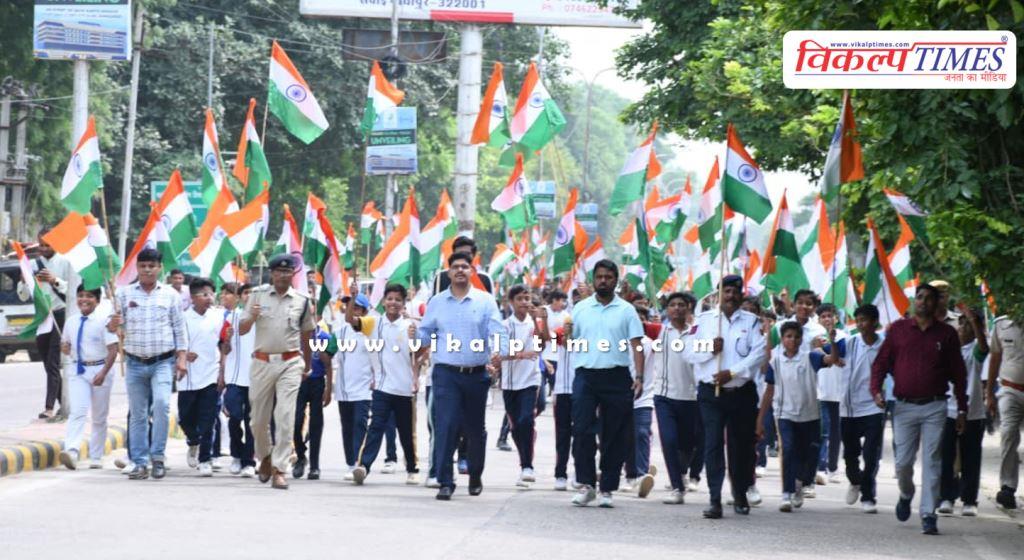 सवाई माधोपुर: आजादी का अमृत महोत्सव के अंतर्गत “हर घर तिरंगा” अभियान जिला कलक्टर काना राम के निर्देशन जिलेभर में देशभक्ति और उत्साह के साथ मनाया जा रहा है। मुख्य कार्यकारी अधिकारी गौरव बुडानिया के नेतृत्व में बुधवार को पुलिस लाइन खेल मैदान से कलेक्ट्रेट परिसर तक भव्य तिरंगा रैली का आयोजन हुआ। मुख्य कार्यकारी अधिकारी गौरव बुडानिया ने हरी झंडी दिखाकर रैली को रवाना किया और स्वयं हाथ में तिरंगा लेकर स्कूली बच्चों के साथ पैदल चलते हुए राष्ट्रप्रेम का संदेश दिया।