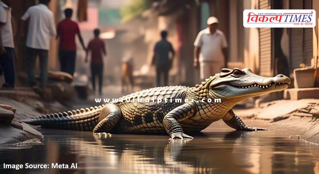 नहर से निकलकर सड़क पर आया मगरमच्छ