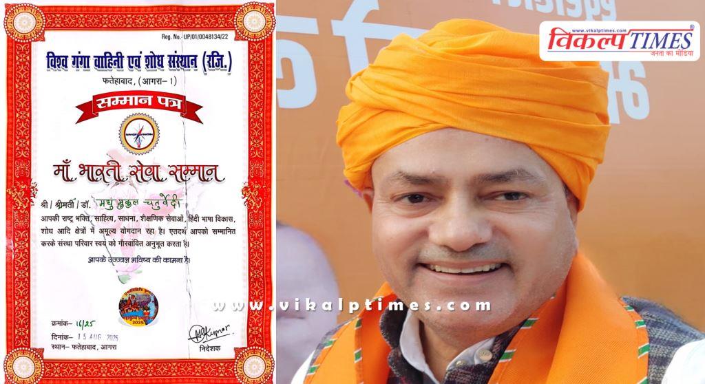 सवाई माधोपुर: वरिष्ठ भाजपा नेता, सेवा निवृत्त प्रोफेसर, साहित्यकार, समाजसेवी, पर्यावरणविद तथा राष्ट्रवादी विचारक डॉ. मधु मुकुल चतुर्वेदी को माँ भारती सेवा सम्मान से राष्ट्रीय स्तर पर सम्मानित किया गया है। विश्व गंगा वाहिनी एवं शोध संस्थान, आगरा द्वारा डॉ. चतुर्वेदी को संस्था के निदेशक डॉ. मुकेश कुमार ऋषि वर्मा द्वारा माँ भारती सेवा सम्मान प्रदान कर सम्मानित किया गया। डॉ. चतुर्वेदी को यह सम्मान उनके द्वारा राष्ट्र भक्ति, साहित्य साधना, शोध, शिक्षा तथा हिंदी भाषा विकास आदि के क्षेत्र में प्रेरक, रचनात्मक एवं उल्लेखनीय कार्यों के लिए प्रदान किया गया है।