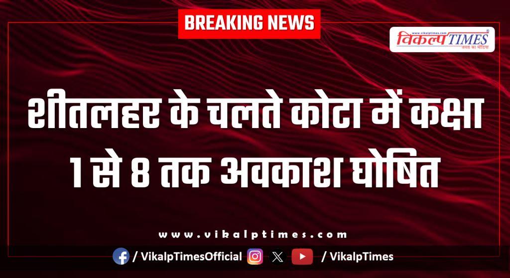 कोटा: शीतलहर के चलते कोटा में कक्षा 1 से 8 तक अवकाश घोषित, छुट्टी को बढ़ाया, जिला कलेक्टर पीयूष समारिया ने प्रारंभिक कक्षा से आठवीं तक के विद्यार्थियों को दो दिवसीय अवकाश किया घोषित, 7 एवं 8 जनवरी का अवकाश घोषित, शेष कक्षाएं सुबह 10 से सायं 4 बजे लगेगी, मौसम विभाग द्वारा जारी पूर्वानुमान के चलते लिया गया निर्णय, विद्यार्थियों का रहेगा अवकाश, शेष स्टाफ यथावत कार्य करेगा, आदेशों की अवहेलना करने पर संस्थान के विरुद्ध आपदा प्रबंधन अधिनियम-2005 के प्रावधानों के तहत होगी कार्रवाई।