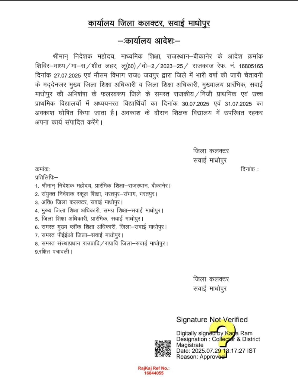 माध्यमिक शिक्षा निदेशालय, राजस्थान बीकानेर के आदेश एवं मौसम विभाग राजस्थान जयपुर द्वारा जिले में भारी वर्षा की चेतावनी के मद्देनजर मुख्य जिला शिक्षा अधिकारी एवं जिला शिक्षा अधिकारी मुख्यालय प्रारंभिक सवाई माधोपुर की अभिशंषा पर जिला कलक्टर काना राम ने जिले के समस्त राजकीय/निजी प्राथमिक एवं उच्च प्राथमिक विद्यालयों में अध्ययनरत कक्षा 1 से 8वीं तक के विद्यार्थियों के लिए 30 एवं 31 जुलाई का दो दिवसीय अवकाश घोषित किया है।