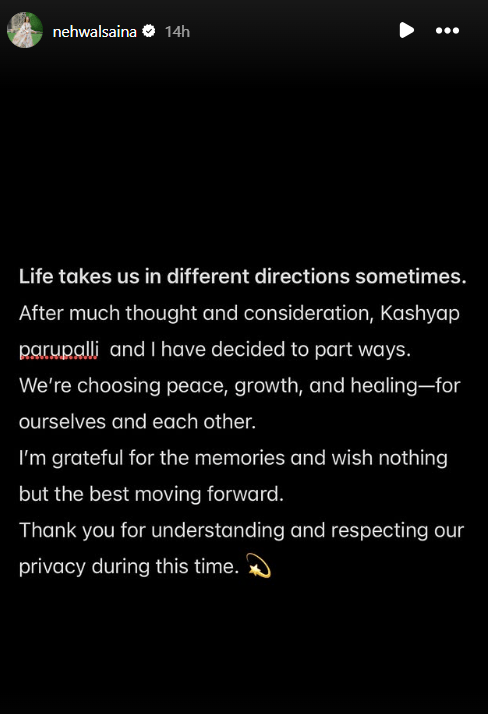 बहुत सोच-विचार के बाद कश्यप पारुपल्ली और मैंने अलग होने का फैसला किया है। उन्होंने लिखा है की मैं यादों के लिए आभारी हूं और आगे के लिए शुभकामनाएं देती हूं। इस दौरान हमारी निजता को समझने और उसका सम्मान करने के लिए धन्यवाद। साइना और कश्यप ने 2018 में शादी की थी।