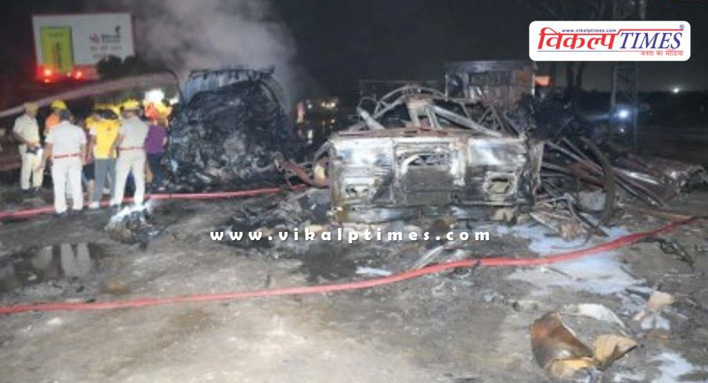 जयपुर: जयपुर-अजमेर हाईवे पर मंगलवार रात 10 बजे LPG गैस सिलेंडर से भरे खड़े ट्रक को केमिकल के टैंकर ने ट*क्कर मा*र दी। इससे ज्वलनशील केमिकल से भरे टैंकर के केबिन में आग लग गई। इस कारण सिलेंडरों में ब्लास्ट हो गया। एक के बाद एक सैंकड़ों सिलेंडर फट गए। कुछ सिलेंडर 500 मीटर दूर-दूर तक खेतों में जा गिरे। 10 किलोमीटर दूर तक ध*माकों की आवाज सुनाई दी। करीब 2 घंटे तक लगातार सिलेंडर फटते रहे। हा*दसे में टैंकर ड्राइवर रामराज मीणा जिं*दा ज*ल गया। फायर ब्रिगेड की 12 गाड़ियों ने 3 घंटे बाद आग पर काबू पाया गया। ट्रक में करीब 330 सिलेंडर थे।
