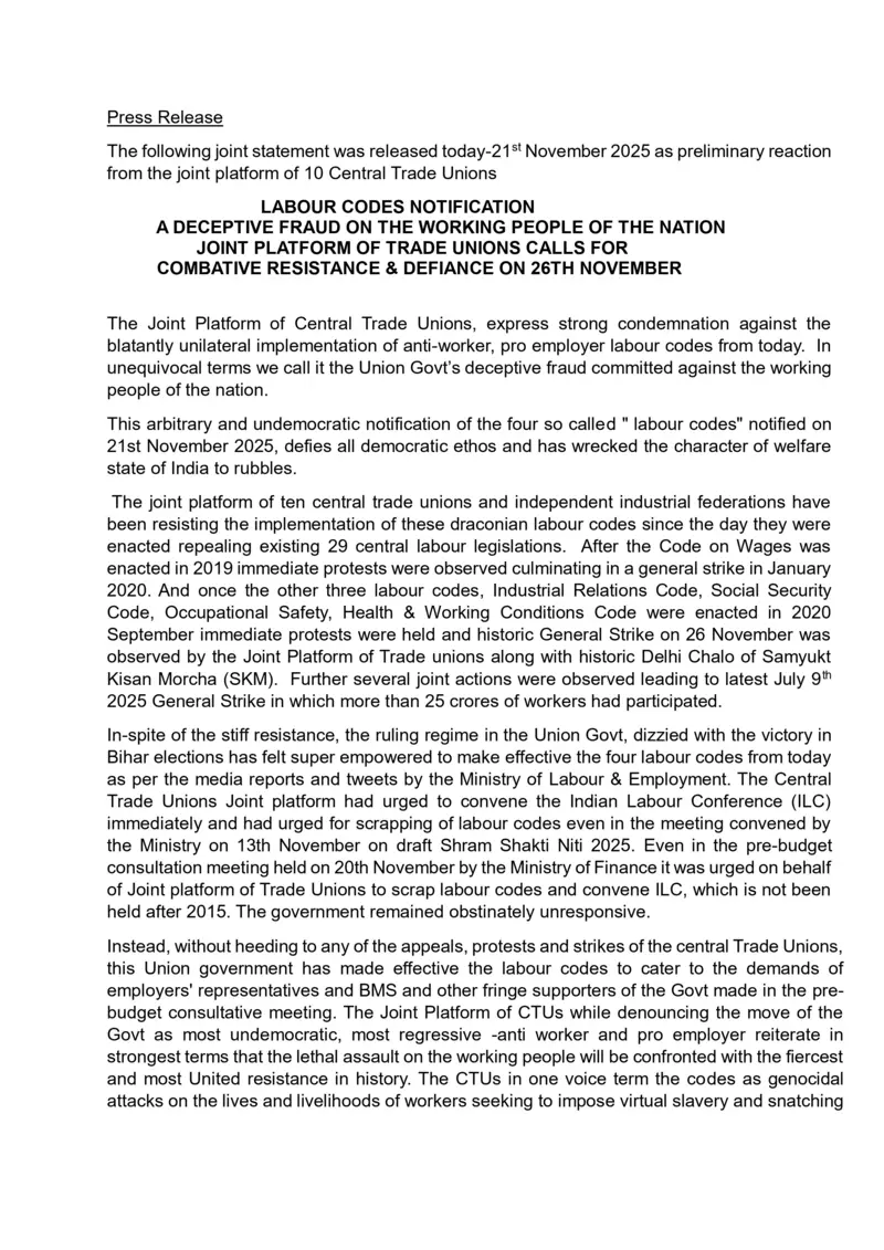 सरकार का दावा है कि इन बदलावों से संगठित और असंगठित दोनों क्षेत्रों के कामगारों को फायदा होगा। प्रधानमंत्री नरेंद्र मोदी ने इस फैसले को ऐतिहासिक बताते हुए एक्स पर पोस्ट किया है। प्रधानमंत्री मोदी ने अपने पोस्ट में लिखा कि श्रमिक भाई-बहनों के लिए ऐतिहासिक दिन है। हमारी सरकार ने चार लेबर कोड लागू कर दिए हैं।