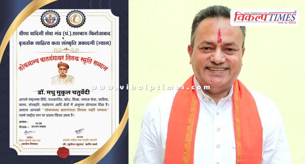 सवाई माधोपुर: वरिष्ठ भाजपा नेता, सेवा निवृत्त प्रोफेसर, साहित्यकार, समाजसेवी, पर्यावरणविद तथा राष्ट्रवादी विचारक डॉ. मधु मुकुल चतुर्वेदी को लोकमान्य बाल गंगाधर तिलक स्मृति सम्मान से राष्ट्रीय स्तर पर सम्मानित किया गया है। वीणा वादिनी सेवा मंच तथा बृजलोक साहित्य कला संस्कृति अकादमी द्वारा लोकमान्य बाल गंगाधर तिलक की जयंती के अवसर पर डॉ. चतुर्वेदी को संस्था के अध्यक्ष डॉ. मुकेश कुमार ऋषि वर्मा तथा सचिव आर्यन निषाद द्वारा लोकमान्य बाल गंगाधर तिलक स्मृति सम्मान प्रदान कर सम्मानित किया गया।
