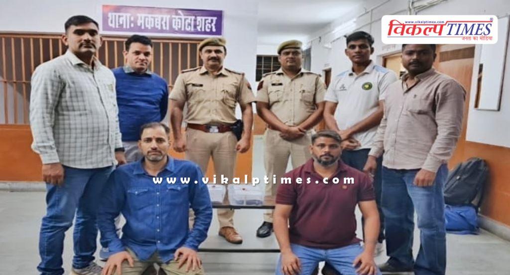 कोटा: कोटा की मकबरा थाना पुलिस की बड़ी कार्रवाई, पुलिस ने अ*वैध ह*थियार 1 पि*स्टल और 5 जिंदा का*रतूस सहित दो आरोपियों को किया गिर*फ्तार, पुलिस ने आरोपी अजय सिंह हाडा उर्फ अज्जू और महेश झांझोट को किया गिर*फ्तार, दोनों कोटा में एक बड़ी वारदात को देने वाले थे अंजाम, चर्चित रणवीर चौधरी ह*त्याकांड के मुख्य वांछित आरोपी है दोनों, आरोपियों की गिर*फ्तारी पर था एक लाख रुपए का इनाम घोषित, पकड़े गए दानों आरोपी शिवराज गैं*ग के सक्रिय सदस्य।