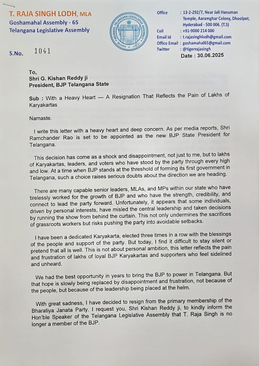 हैदराबाद: हैदराबाद की गोशामहल विधानसभा सीट से विधायक टी राजा सिंह ने भारतीय जनता पार्टी से इस्तीफा दे दिया है। उन्होंने इसकी जानकारी सोशल मीडिया प्लेटफॉर्म एक्स पर दी है। टी राजा सिंह ने एक बयान जारी कर बीजेपी से नाराजगी जाहिर की है। उन्होंने अपने बयान में कहा है कि मैं यह पत्र भारी मन और गहरी चिंता के साथ लिख रहा हूं। मीडिया रिपोर्ट्स के अनुसार रामचंद्र राव को तेलंगाना के लिए बीजेपी का नया प्रदेश अध्यक्ष नियुक्त किया जाना तय है।