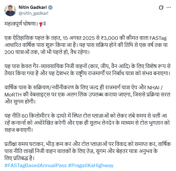 नई दिल्ली: सड़क परिवहन एवं राजमार्ग मंत्री नितिन गडकरी ने इस साल 15 अगस्त से फास्टैग आधारित सालाना पास शुरू करने की घोषणा की है। इस पास की कीमत तीन हजार रुपये होगी। यह पास सिर्फ निजी इस्तेमाल की कारों, जीपों और वैन के लिए होगा।