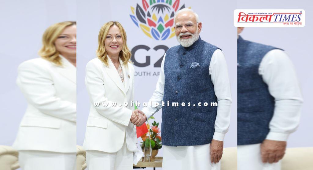 नई दिल्ली: प्रधानमंत्री नरेंद्र मोदी ने रविवार को दक्षिण अफ्रीका के जोहान्‍सबर्ग में जी 20 शिखर सम्मेलन से अलग इटली की प्रधानमंत्री जॉर्जिया मेलोनी से मुलाकात की है। न्यूज एजेंसी पीटीआई के अनुसार भारत और इटली ने व्यापार, रक्षा और सुरक्षा सहित कई क्षेत्रों में द्विपक्षीय संबंधों को मजबूत करने पर चर्चा की।