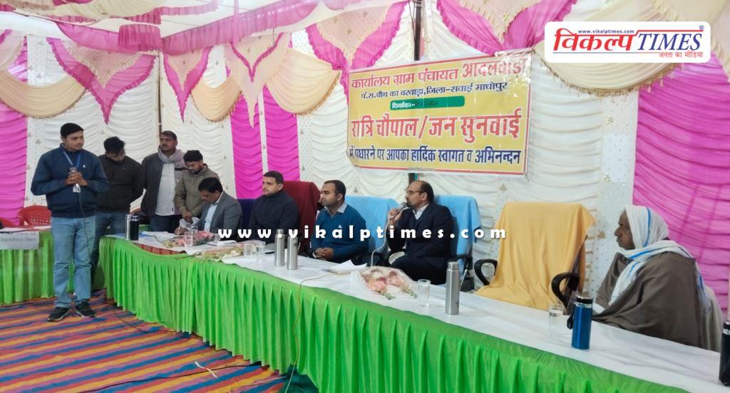 सवाई माधोपुर: प्रदेश के मुख्यमंत्री भजनलाल शर्मा की मंशानुरूप आमजन की समस्याओं का त्वरित एवं प्रभावी समाधान सुनिश्चित करने के उद्देश्य से गुरुवार को जिला कलक्टर काना राम की अध्यक्षता में पंचायत समिति चौथ का बरवाड़ा की ग्राम पंचायत आदलवाड़ा के भारत निर्माण राजीव गांधी सेवा केंद्र में रात्रि चौपाल का आयोजन किया गया।
