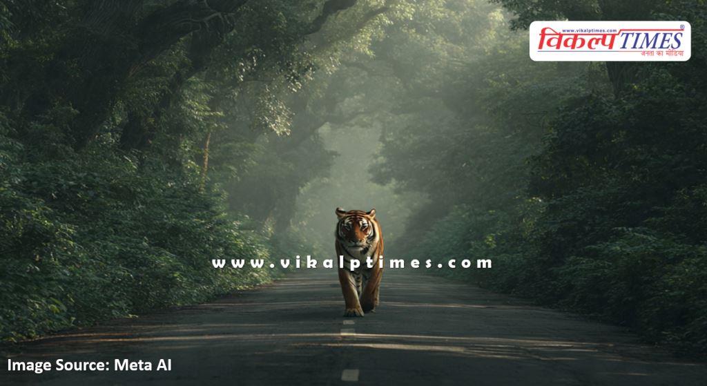 जंगल से निकलकर सड़क पर पहुंचा बाघ